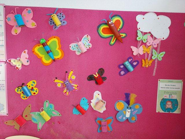Os alunos do 1.º ciclo do ensino básico estiveram a recortar, a dobrar e a pintar muitos pássaros coloridos para enfeitar as paredes da escola.