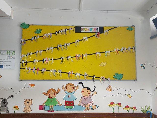 Os alunos do 1.º ciclo do ensino básico estiveram a recortar, a dobrar e a pintar muitos pássaros coloridos para enfeitar as paredes da escola.