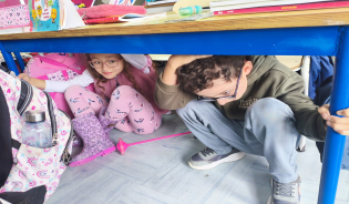 Durante o simulacro, os alunos foram sensibilizados para a importância de saber como agir antes, durante e depois de um sismo, aprendendo e praticando os três gestos essenciais de proteção — baixar, proteger e aguardar.